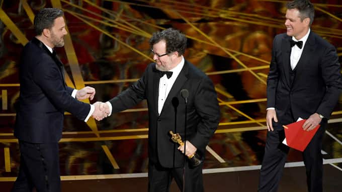 Ben Affleck und "Gast". Jimmy Kimmel kümmerte sich darum, dass sein "Erzfeind" von der Bühne gespielt wird. Den Oscar® konnten Affleck und Matt Damon aber dennoch vergeben ...