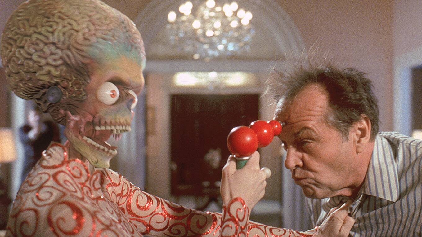 Die kommen nicht in Frieden! In Tim Burtons quietschbunter Parodie auf Alienfilme der 50er versuchen Invasoren vom Mars u.a. Jack Nicholson, Pierce Brosnan und Sarah Jessica Parker zu pulverisieren. - Au-erirdische vom Mars landen auf der Erde, unter anderem auch in Washington. US-Präsident Dale (Jack Nicholson) und viele andere glauben zunächst an eine friedliche Mission der Außerirdischen. Ein fataler Irrtum. Schnell wird klar, dass Zivilisten und Militärs den Waffen der Invasoren unterlegen sind und der Untergang der Menschheit besiegelt scheint.