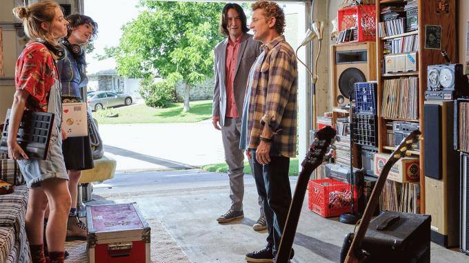 Bill (Alex Winter, rechts) und Ted (Keanu Reeves) tragen zudem als Väter von Thea (Samara Weaving, links vorne) und Billie (Brigette Lundy-Paine) viel Verantwortung.