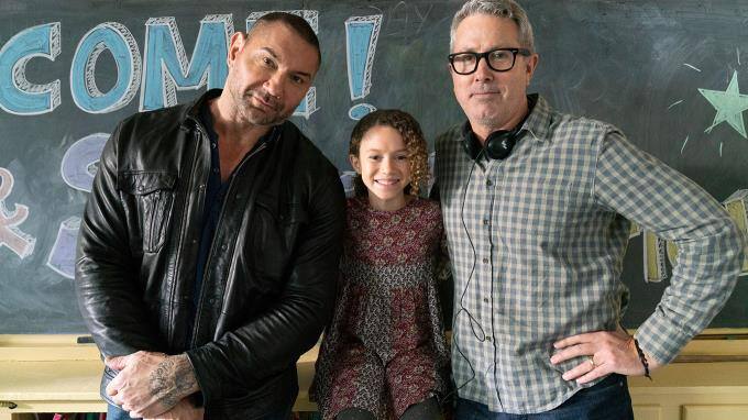 Regisseur Peter Segal mit seinen beiden Hauptdarstellern Dave Bautista und Chloe Coleman.