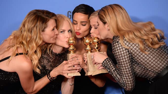 Küsschen für den goldenen Globus. Laura Dern, Nicole Kidman, Zoe Kravitz, Reese Witherspoon und Shailene Woodley freuen sich über drei Awards für die "Beste Mini-Drama-Serie": "Big Little Lies".