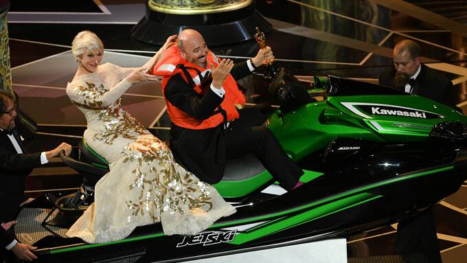 Jimmy Kimmels Versuch die Oscars® kurz zu halten, indem er den Nominierten mit der kürzesten Gewinner-Rede einen Jetski versprach, ging nicht ganz auf. Während Rockwell noch versuchte sich für das Wassersportgerät ins Rennen zu bringen, ließ der "Beste Hauptdarsteller" Gary Oldman gleich wissen, dass er den Jetski wohl nicht gewinnen werde. Am Ende setzte sich Kostümdesigner Mark Bridges durch.