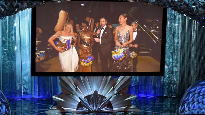 Jimmy Kimmel ließ es sich auch dieses Jahr nicht nehmen, erneut Stars und Fans wieder zusammenzubringen. Gemeinsam mit Stars wie Gal Gadot, Mark Hamill, Emily Blunt und Armie Hammer stürmte er mit Snacks bewaffnet ein Kino gegenüber des Dolby Theaters. Die überraschten Kinogäste waren begeistert.