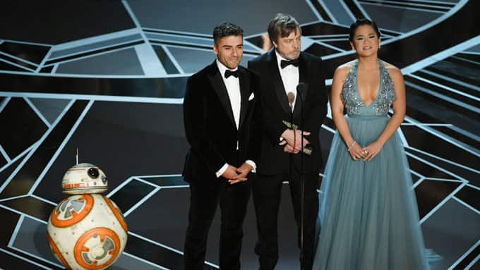 Der Cast von "Star Wars: The Last Jedi" - Oscar Isaac, Mark Hamill, Kelly Marie Tran und BB8.