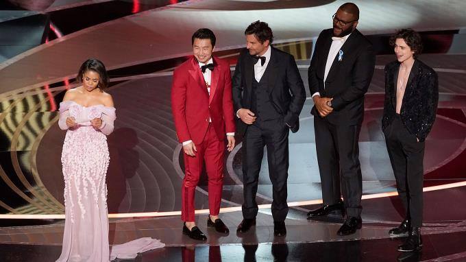 Moderatorin Regina Hall, die gleich am Anfang des Abends klarstellte, dass sie Single ist, holte sich mit dem Vorwand, es müssten noch Covid-Tests durchgeführt werden Simu Liu, Bradley Cooper, Tyler Perry, und Timotée Chalamet auf die Bühne. Zum Test, Backstage, mit Zunge ...