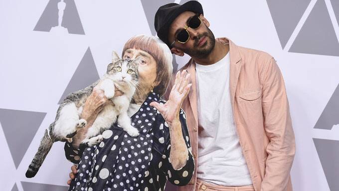 Regisseur JR mit der Pappfigur seiner Kollegin Agnès Varda. Die beiden sind für "Faces Places" -"Bester Dokumentarfilm" nominiert.