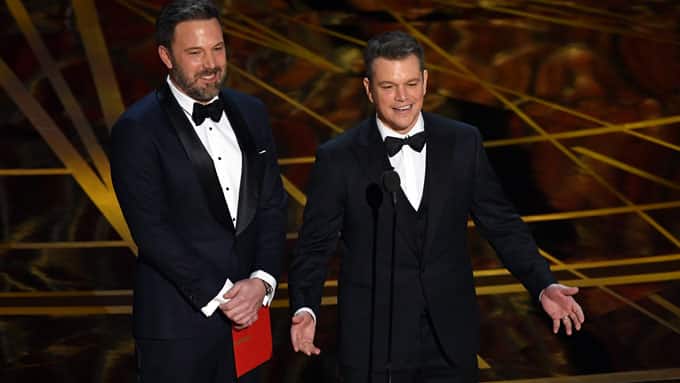 Ben Affleck und "Gast". Jimmy Kimmel kümmerte sich darum, dass sein "Erzfeind" von der Bühne gespielt wird. Den Oscar® konnten Affleck und Matt Damon aber dennoch vergeben ...