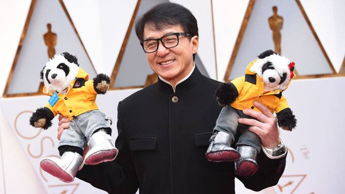 Jackie Chan nahm als Panda-Botschafter zwei der Tierchen als Kuscheltiere mit.