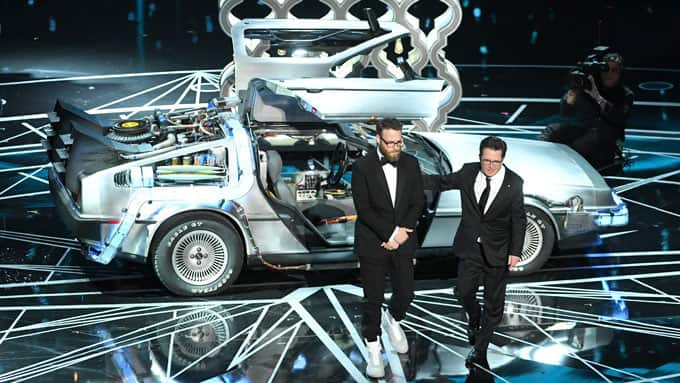 Kamen per Zeitmaschine: Michael J. Fox und Seth Rogen.