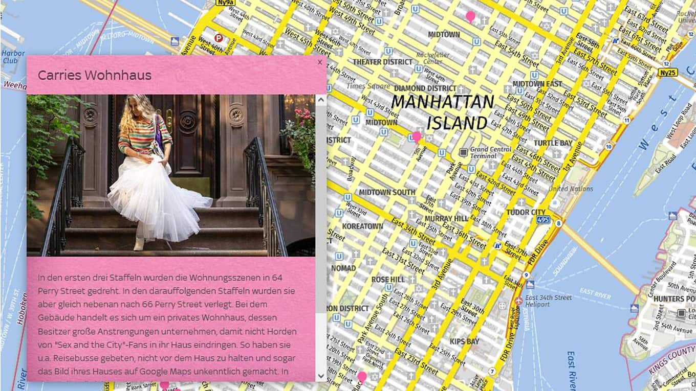 Wo in New York befindet sich Carries Wohnung und in welchem Szeneviertel wohnt Samantha? Warum hat die Brooklyn Bridge für Miranda eine so große Bedeutung und welcher Galerie arbeitet Charlotte? Im klickbaren "Sex and the City"-Stadtplan gibt es spannende Infos zu den wichtigsten Locations aus der Serie und Drehorten in New York City sowie den Schauplätzen aus der neuen Serie "And Just Like That...".