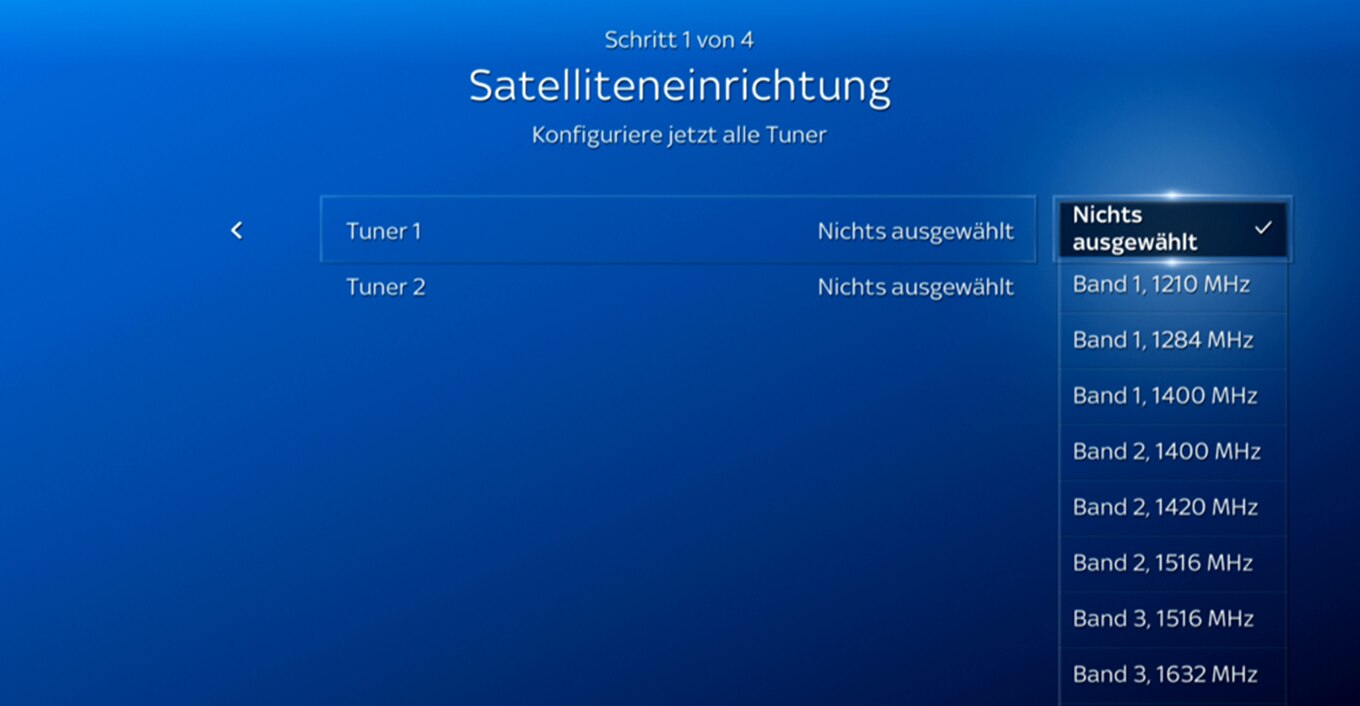 Welche Frequenzen zu deiner SatCR-Anlage passen, kannst du in der Installationsanleitung der Anlage nachlesen. Wähle nun jeweils ein passendes Tuner-Band für Tuner 1 und Tuner 2 aus.