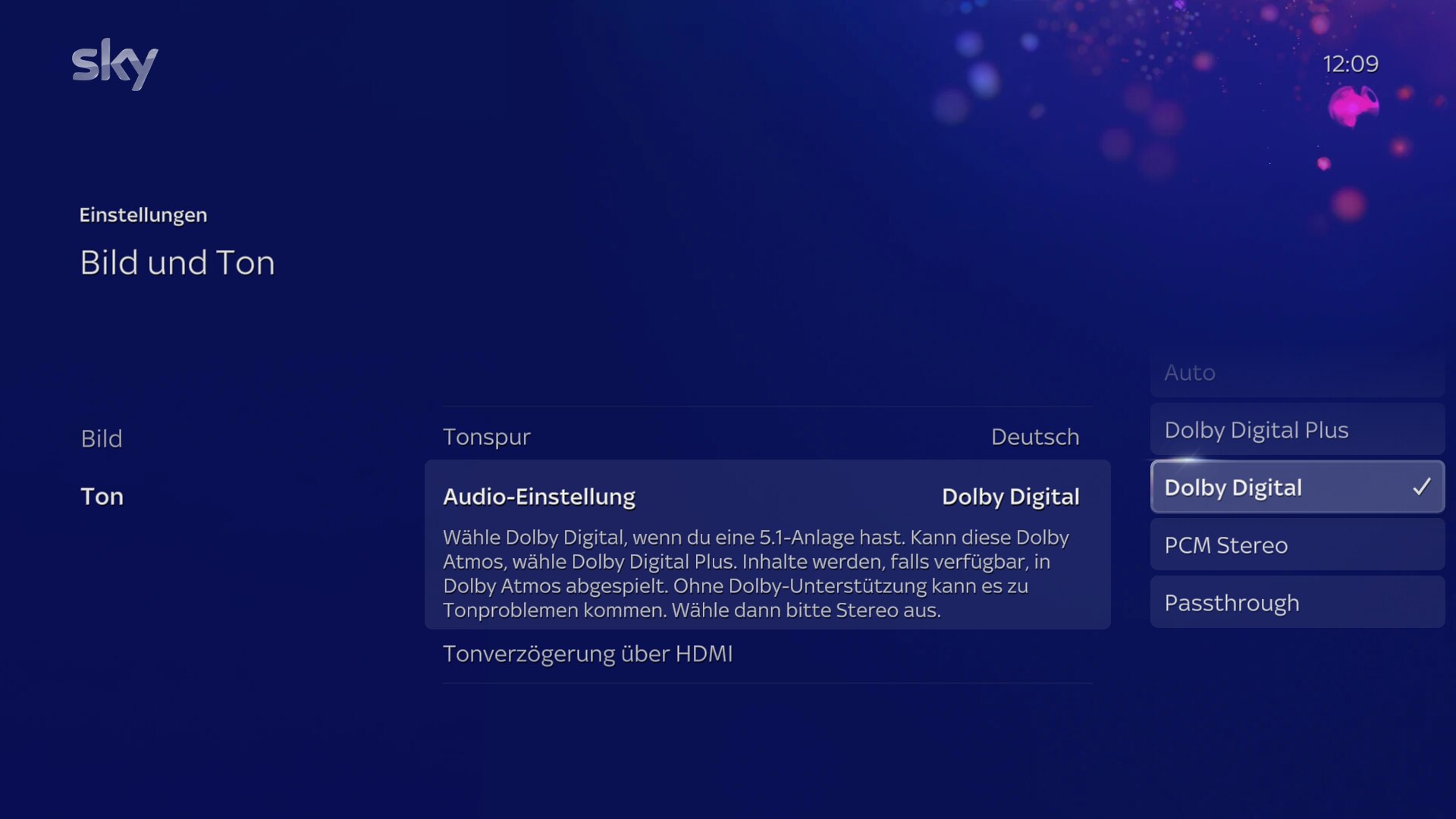 - Dolby Digital (Dolby Digital AC-3, 6 Channel (5.1)): bei fast alle linearen Sky Sendern, bei Sky Store und in Apps (egal ob Dolby 2.0 oder 5.1)