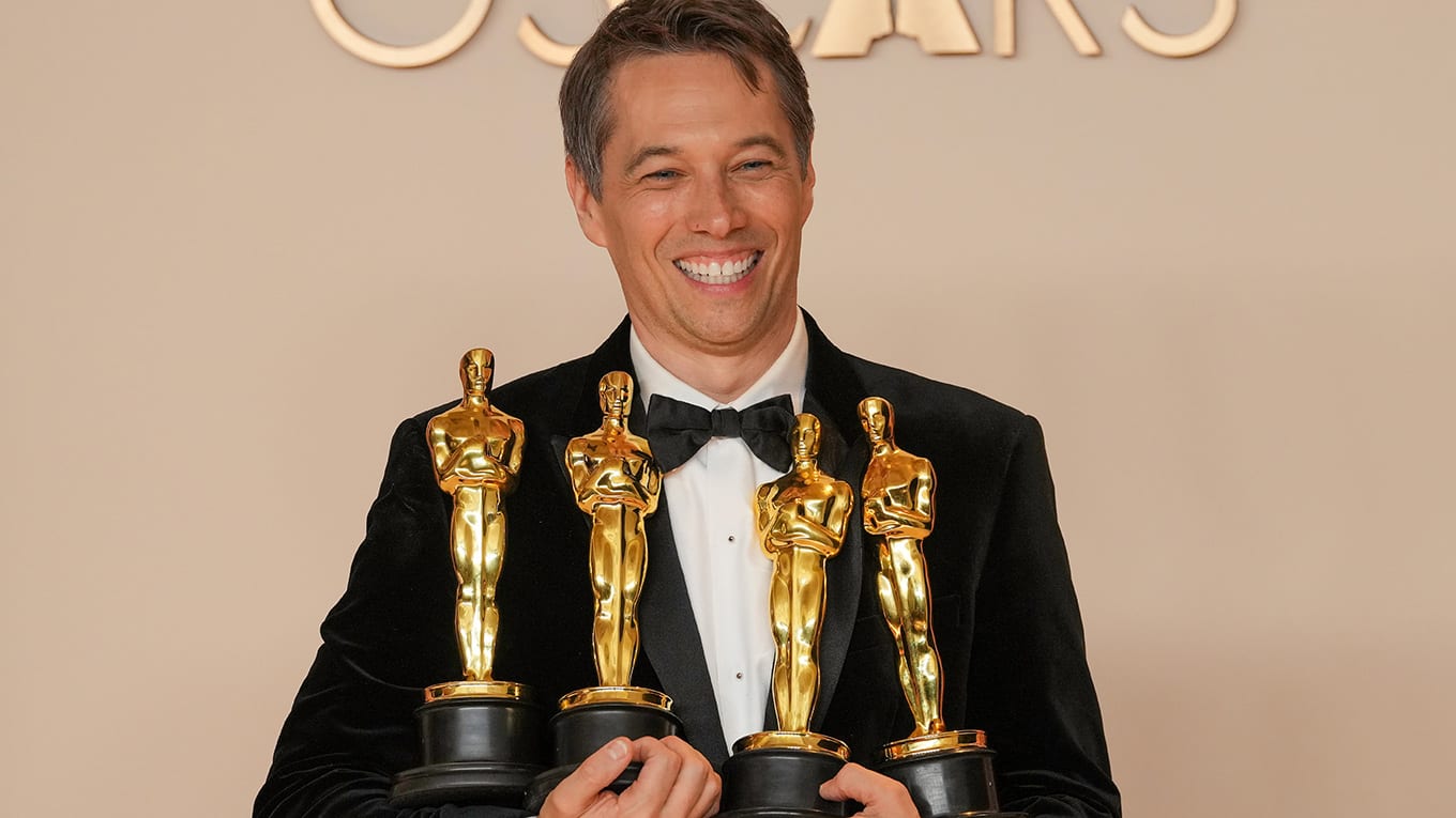 Stolz wie Oscar: "Anora"-Autor und -Regisseur Sean Baker präsentiert überglücklich seine vier Academy Awards.