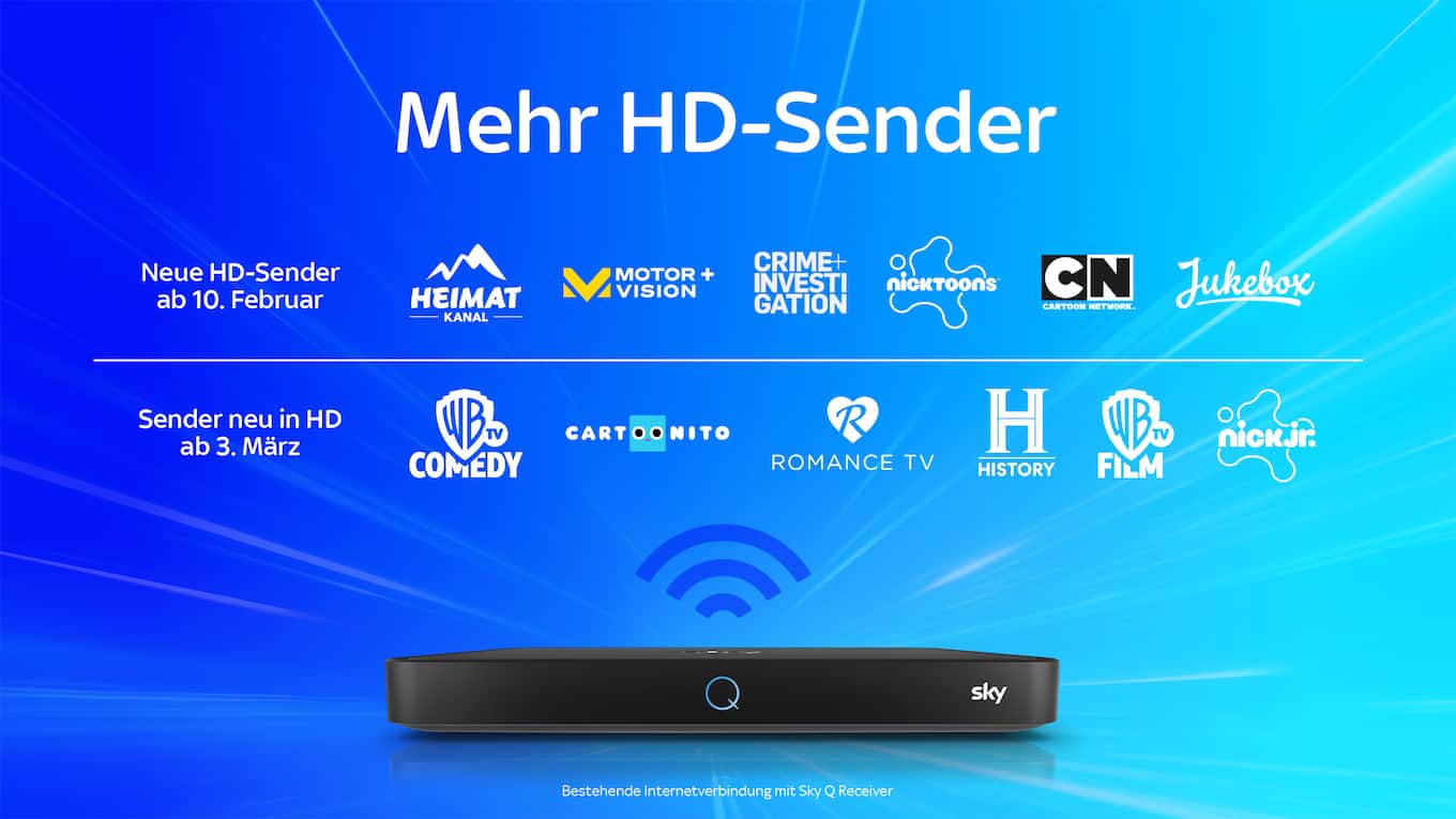 Freue dich auf ein noch besseres TV-Erlebnis! Zukünftig überträgt Sky im VodafoneKabelnetz die meisten Sender über das Internet. Dadurch empfängst du mehr Sender in besserer Bildqualität – ab dem 9. Februar zusätzliche HD-Sender und ab dem 2. März bisherige SD-Sender in HD-Qualität. Damit du die neuen HD-Sender und viele weitere Vorteile deines Sky Abos nutzen kannst, stelle bitte sicher, dass dein Sky Q Receiver dauerhaft mit dem Internet verbunden ist.