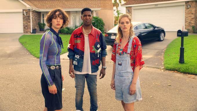 Brigette Lundy-Paine (links) und Samara Weaving spielen die Töchter Billie Logan und Thea Preston der beiden Zeitreisenden. Musiker Kid Cudi (Mitte) spielt im Film sich selbst.