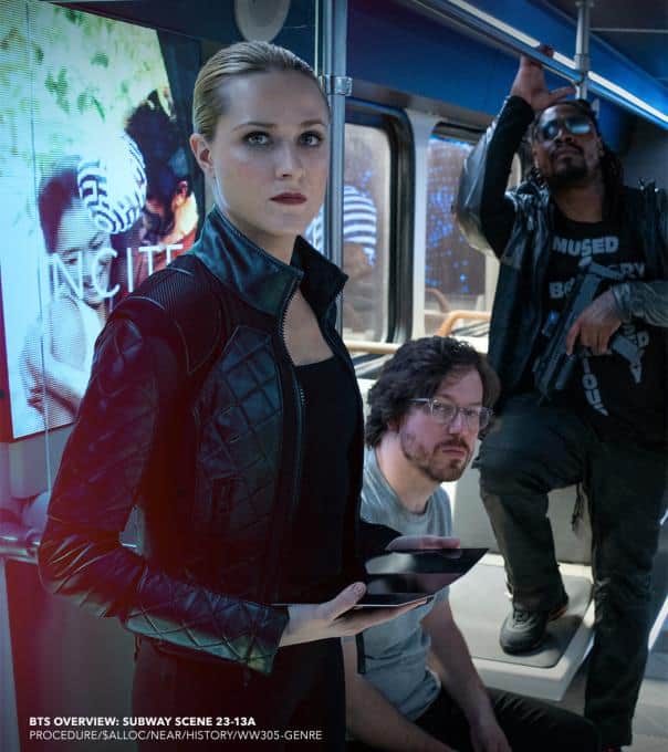 Evan Rachel Wood als Dolores, John Gallagher Jr (Mitte) als Liam Dempsey und Marshawn Lynch als Giggles