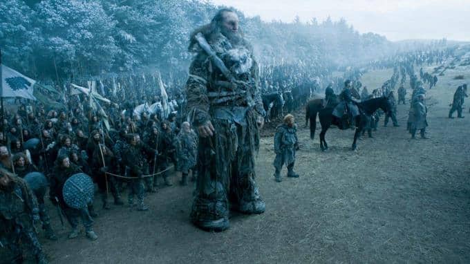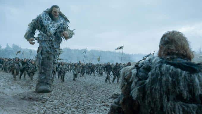 Jon sieht, wie Ramsay zurück nach Winterfell flieht und sich dort verschanzt. Zusammen mit Tormund (Kristofer Hivju) und dem Riesen Wun-Wun (Ian Whyte) folgt er ihm. Der bereits schwer verwundete Wun-Wun wendet seine letzte Kraft auf, um das Tor von Winterfell aufzubrechen. Den Todesschuss setzt ihm schließlich Ramsay mit einem Pfeil durch das Auge in den Kopf zu – der letzte Riese von Westeros ist gefallen.