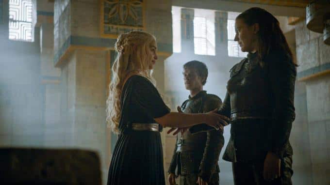 Daenerys ist etwas misstrauisch, aber auch beeindruckt von Ashas Verhandlungsgeschick und Stärke. Sie willigt unter der Bedingung ein, dass die Eisenmänner mit ihren Raubzügen und Vergewaltigungen aufhören. Asha stimmt dem zu und der Pakt wird besiegelt.