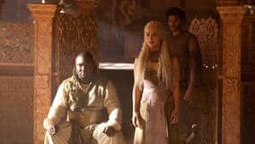 5. Staffel, Folge 5: Jorah Mormont ist mit seinem Gefangenen Tyrion unterwegs nach Meereen. Dort muss Daenerys eine schwere Entscheidung treffen. Jon Schnee wählt einen überraschenden Verbündeten, um den Eiswall zu sichern.