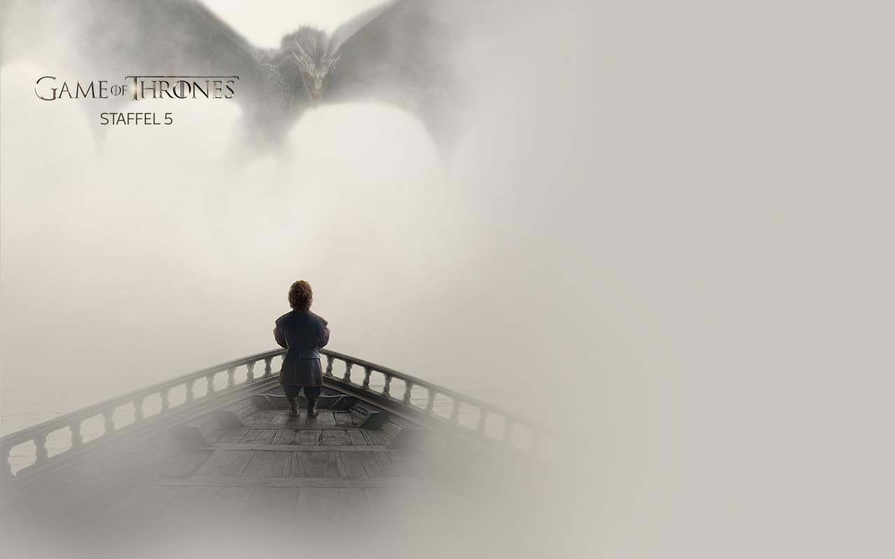 5. Staffel, Folge 1: Nach dem Mord an seinem Vater muss Tyrion fliehen. Daenerys trifft in Meereen zunehmend auf Widerstand. Derweil versucht Jon Schnee, zwischen Mance Rayder und Stannis Baratheon zu vermitteln.
