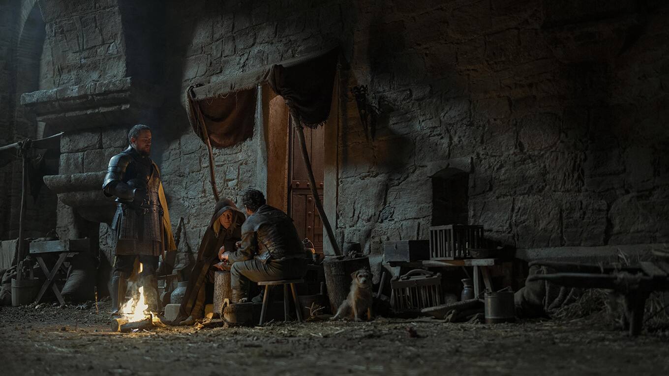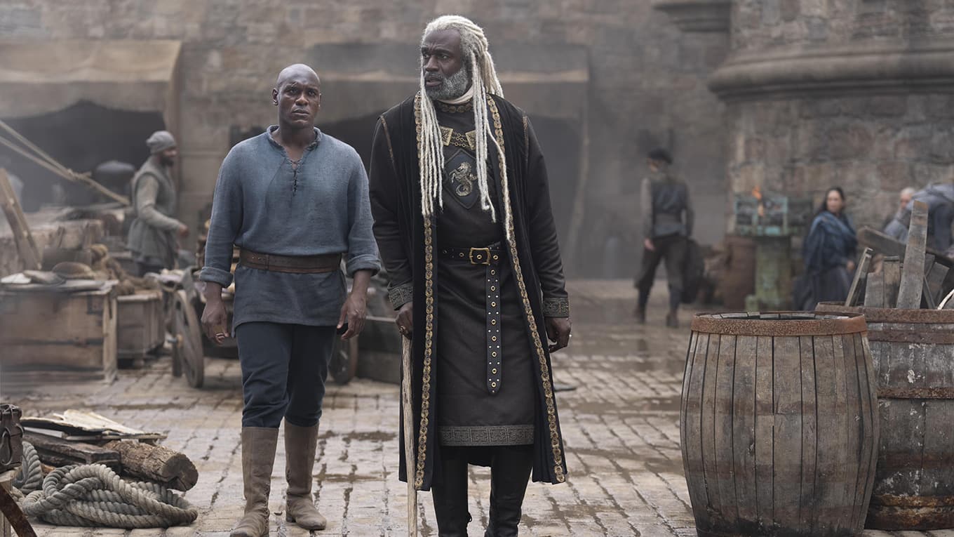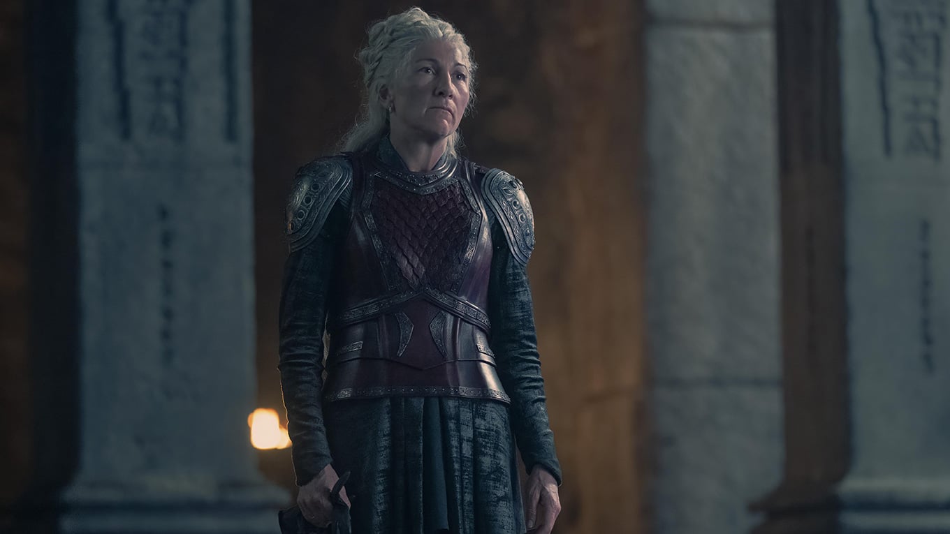 Unterdessen patrouilliert Rhaenys Velaryon (Eve Best) auf ihrem Drachen Meleys den Seeweg, um die Blockade aufrechtzuerhalten. Ihr Mann Lord Corlys (Steve Toussaint) befehligt derweil seine mächtige Schiffsflotte, um den Handelsweg nach Königsmund abzuschneiden.