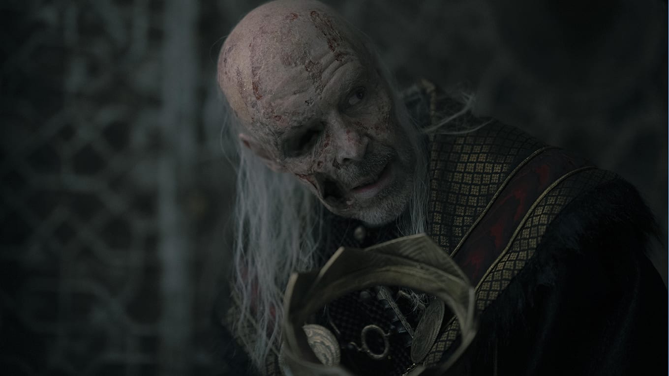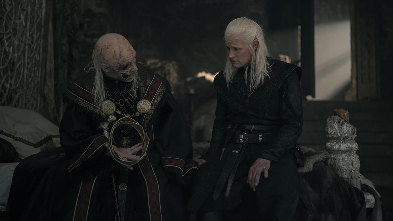 Anschließend an die erfolgreiche Verhandlung hat Daemon eine weitere Vision, in der er neben seinem Bruder Viserys (Paddie Considine) sitzt. Der König ist durch seine Krankheit schwer gezeichnet. Er erklärt, dass er die Krone nie haben wollte, denn sie bringe nur Schmerz und erdrücke jeden, der sie trage. Daemon habe sie hingegen immer gewollt. "Willst du sie immer noch?", fragt Viserys und hält seinem Bruder die Krone hin.