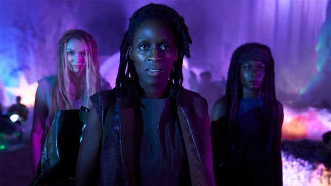 Auf dem Raumschiff kommt es zur Meuterei unter der Anführerin Tula (Sharon Duncan-Brewster). Im Bildhintergrund sind zu sehen (v.l.): Eleanor Tomlinson und Diany Samba-Bandza.