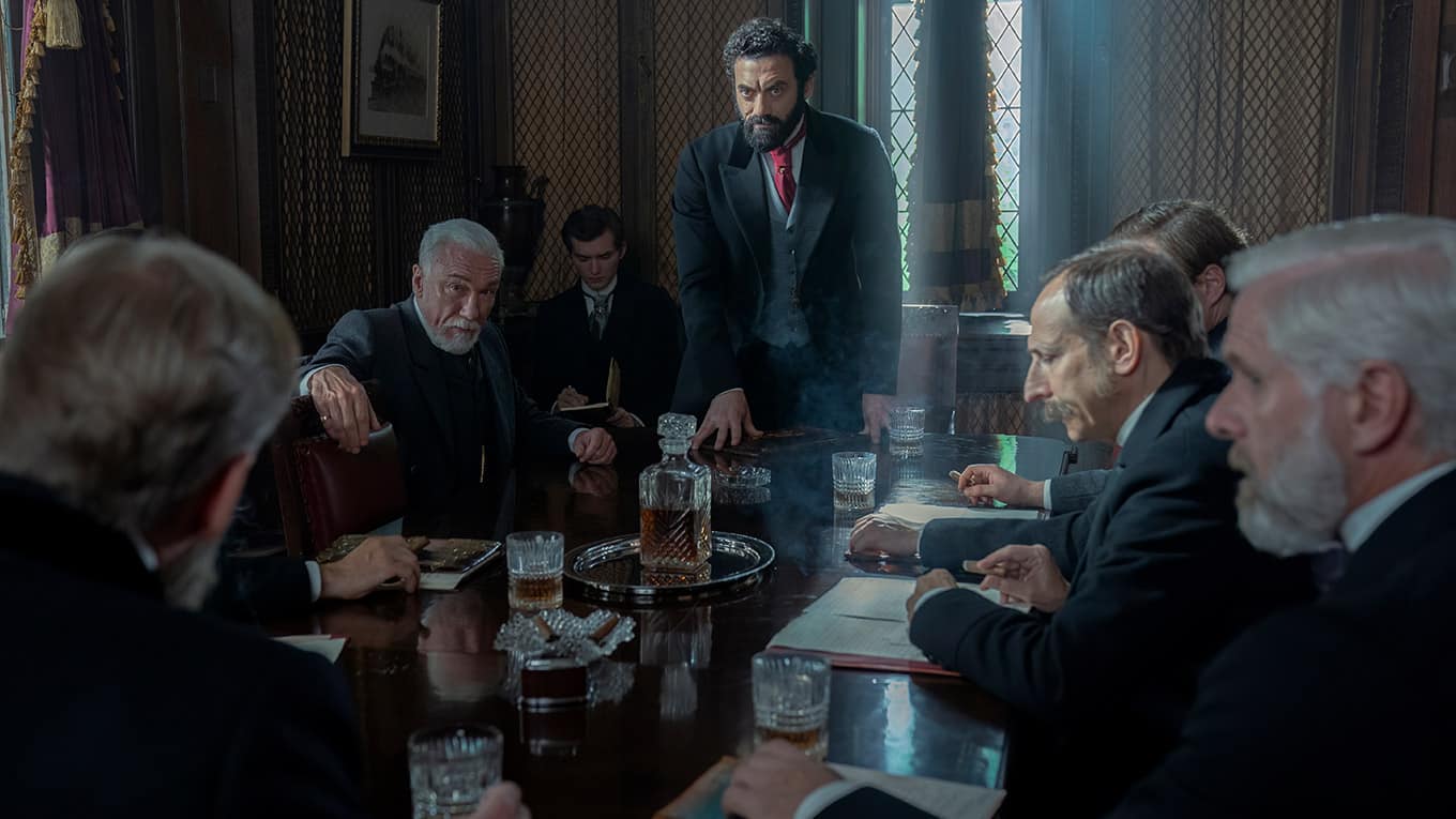 Unterdessen nimmt Berthas Ehemann George Russell (Morgan Spector, stehend im Bild) seinen eigenen Kampf mit einer wachsenden Gewerkschaft in seinem Stahlwerk in Pittsburgh auf.