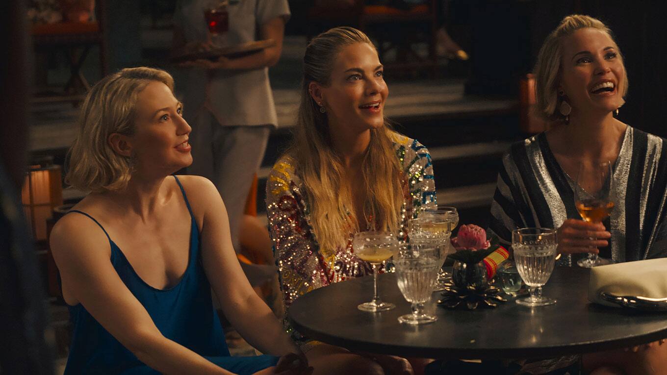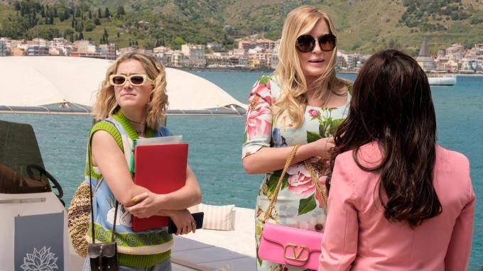 Romantikreise zu dritt: Tanya (Jennifer Coolidge, M.) hat außer ihrem Mann auch ihre Assistentin Portia (Haley Lu Richardson, l.) mit in den Urlaub genommen.