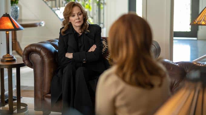 Jane (Frances Fisher) reagiert gelassen und gibt zu, dass dies die ursprüngloiche Idee war. Nun hätte sich aber etwas Außergewöhnliches ereignet, das einen neuen Plan erfordere. Dann drückt die Witwe auf einen Knopf und katapultiert Blake samt Sofa einen Stock tiefer in den Keller,
