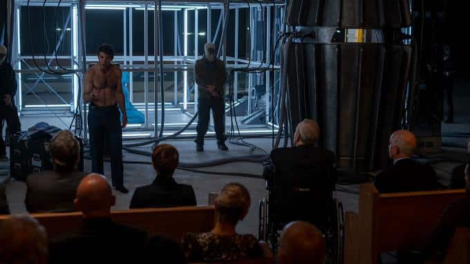 Senator Joe Keene (James Wolk) hat alle Zyklop-Mitglieder im Hauptquartier der Siebten Kavallerie versammelt, um ihnen voller Stolz zu zeigen, wie er Dr. Manhattans Kräfte absorbiert und auf sich selbst überträgt.