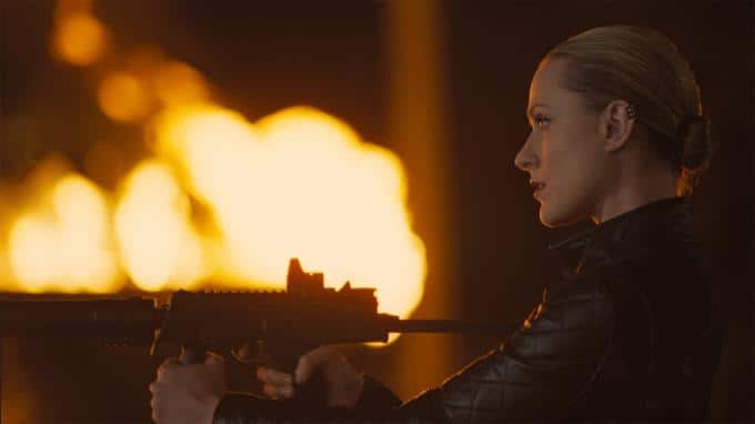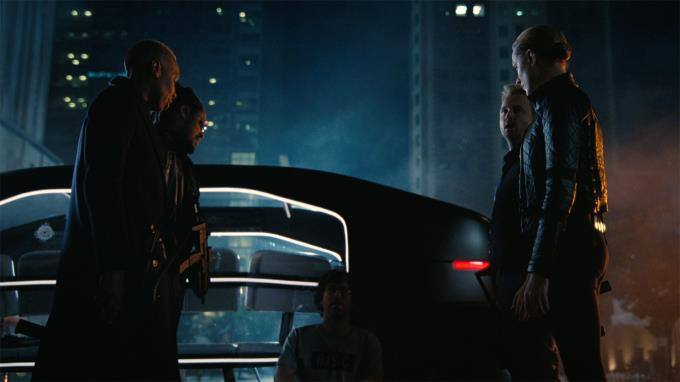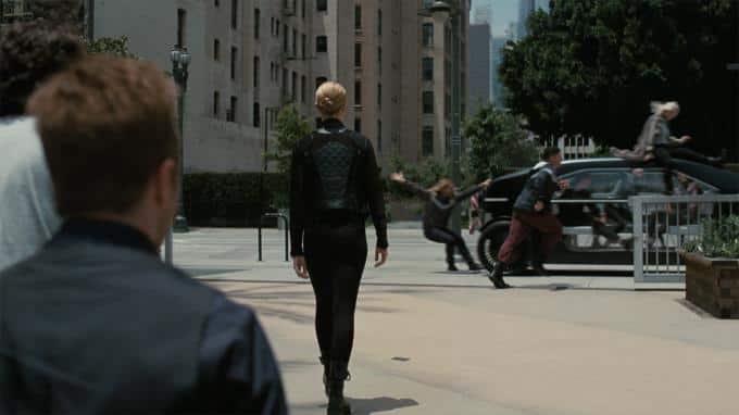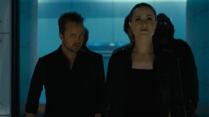 Unterdessen schießt Caleb (Aaron Paul) auf die Verfolger und schafft es, einige Wagen auszuschalten.