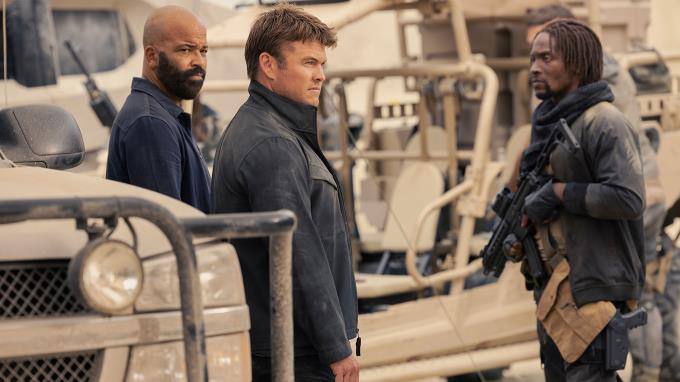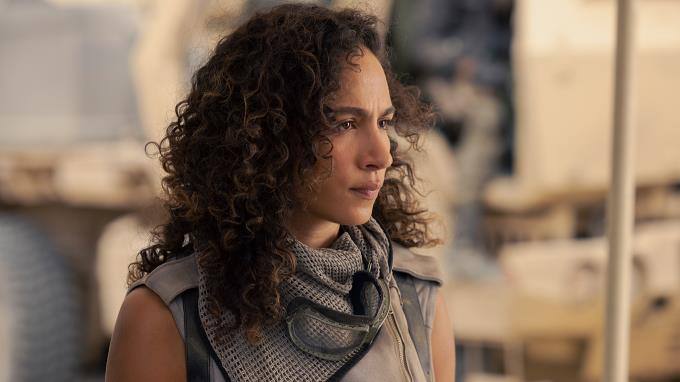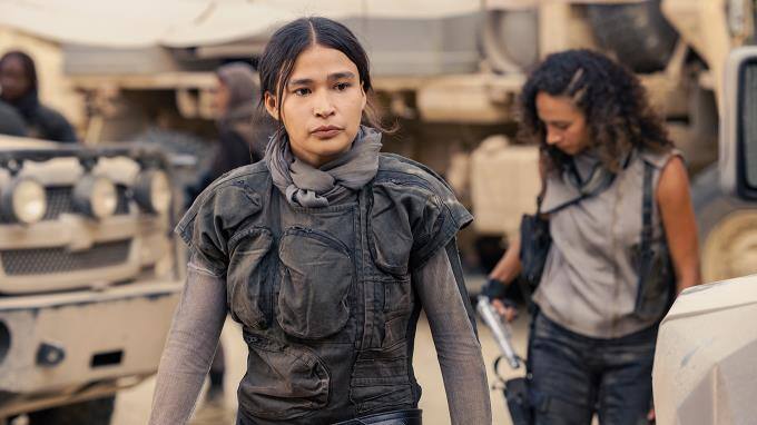 Die beiden helfen der Organisation, zu der auch C (Aurora Perrineau, rechts) und Odina (Morningstar Angeline) gehören, eine versteckte Waffe in der Wüste zu finden.