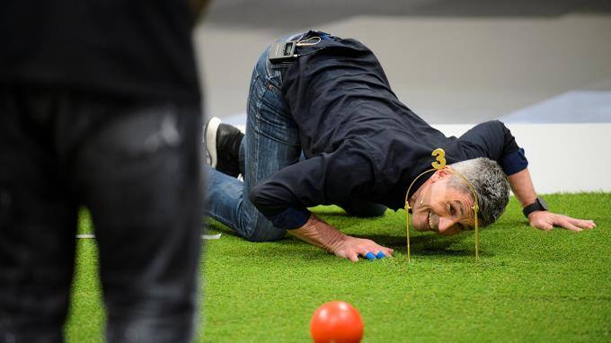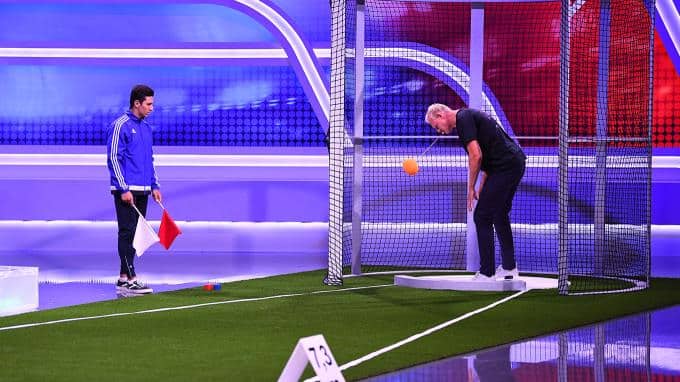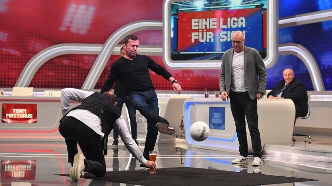 Beim Torwandschießen mit Hindernissen will's Teamchef Matthäus wieder wissen.