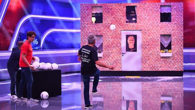 Im ersten Spiel werden Klompen (holländischer Holzschuh) zum Dosenwerfen verwendet - während Andy Brehme da erhebliche Schwierigktein hat ...