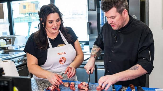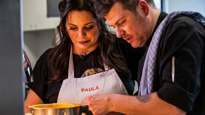 Paula darf zuerst mit Daniel loslegen und hat 75 Minuten Zeit für ihr Gericht. Sie ist sehr froh, Daniel an ihrer Seite zu haben: "Alleine wäre ich aufgeschmissen oder es würde was sehr Lustiges dabei herauskommen." Dann muss sie sich unter den verschiedenen Zutaten pro Geschmackssinn etwas aussuchen – damit es einfacher ist, sind auf einer Tafel für jeden Geschmackssinn mögliche Zutaten angegeben. Gemeinsam mit Daniel bespricht sie ihre Idee und legt dann los.