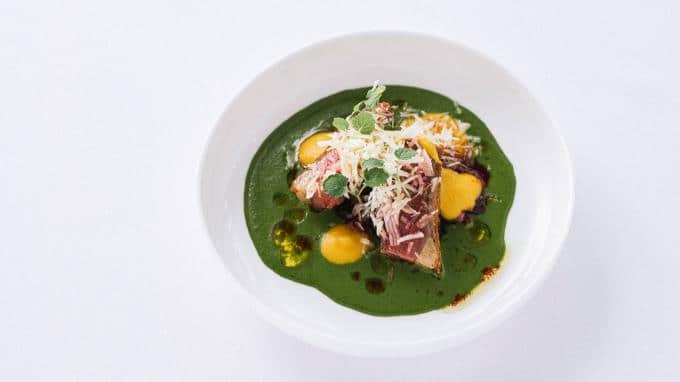 Sie serviert "Taubenbrust mit Süßkartoffelpüree und Liebstöckelsoße".