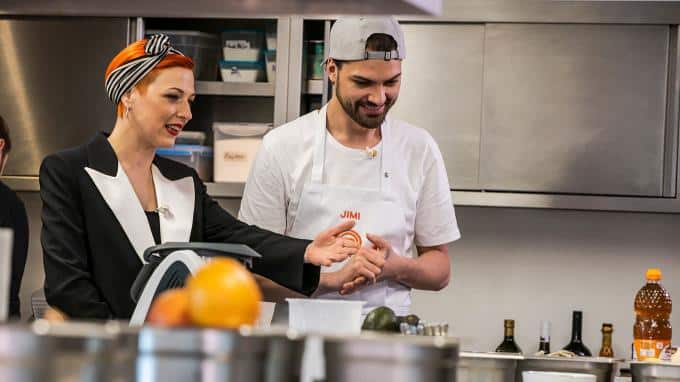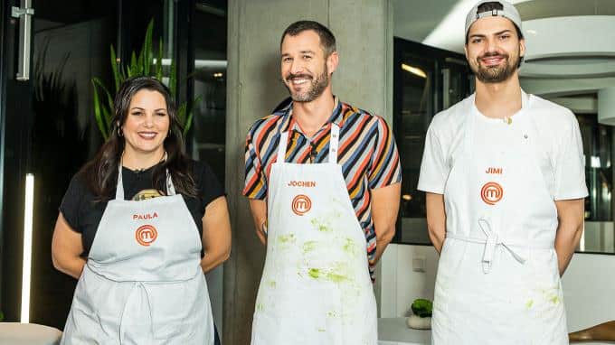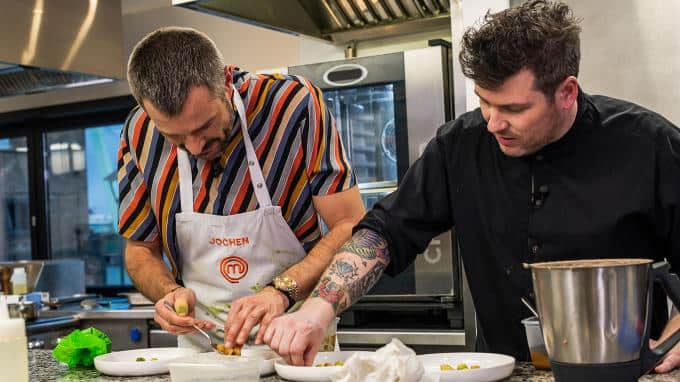 Jochen und Jimi dürfen es sich in der Zwischenzeit gemütlich machen und erstmal abwarten. Ralf glaubt, dass Paula vor allem der Zeitdruck zu schaffen machen wird. Dann holt Erik auch schon Jimi ab und nach einem gemeinsamen Beratschlagen über die Zutaten legt auch dieses Duo los.