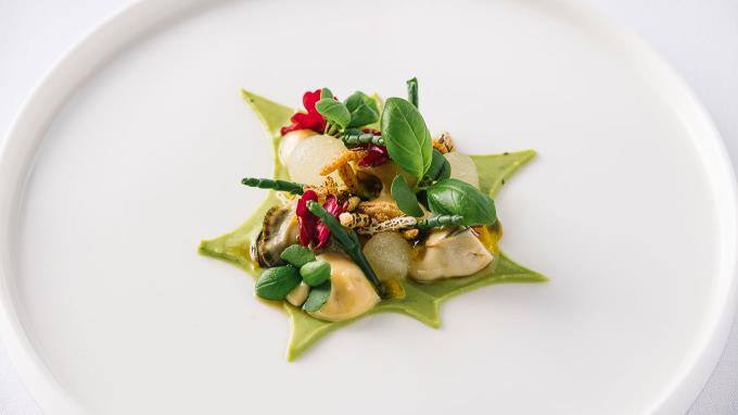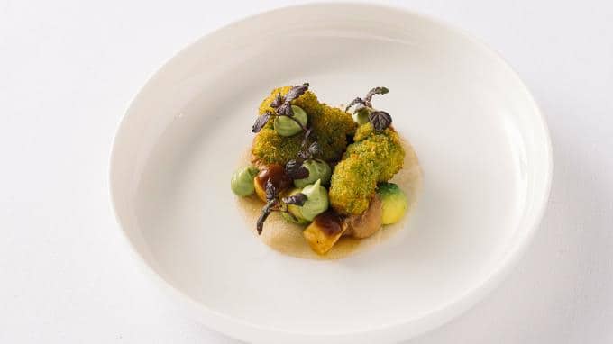 Er serviert "Austern in Teriyaki-Soße mit Nashi-Birne und frittiertem Wildreis".