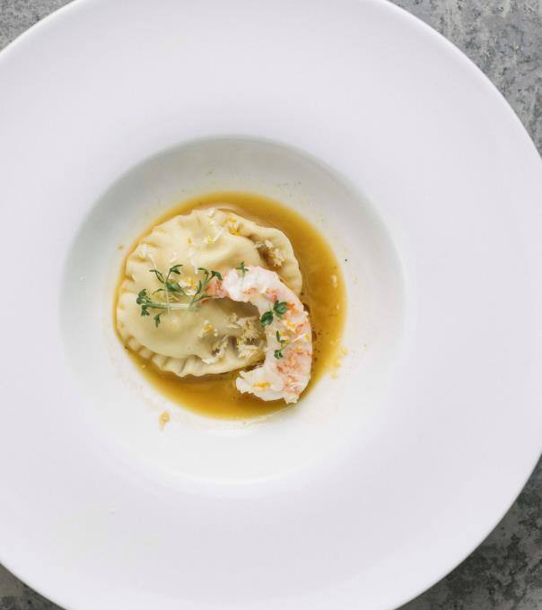 Langustinen-Ravioli im eigenen Fond und Mandarinen-Abrieb.
