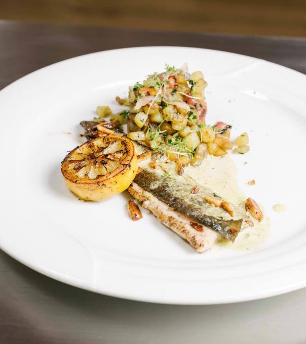 Forellenfilet mit Bratkartoffeln und Kapernsoße.
