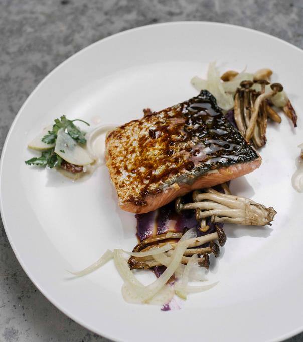 Damit zaubert April Lachs Sous Vide auf lila Kartoffelpüree und Enokipilzen.