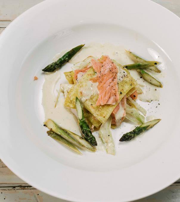 Das Ergebnis ist eine offene Lasagne mit Lachs und grünem Spargel.