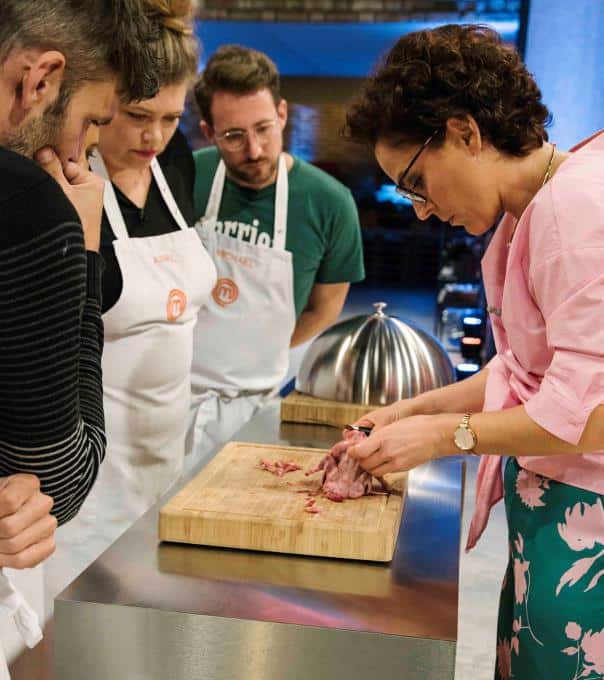 Für letzten fünf Kandidaten der MasterClass aber wird’s heute wieder stressig. Ein Gericht aus der Küche von Sybille Schönberger steht auf dem Plan: gestopfte Wachtel mit Selleriepüree und Gänselebersauce.