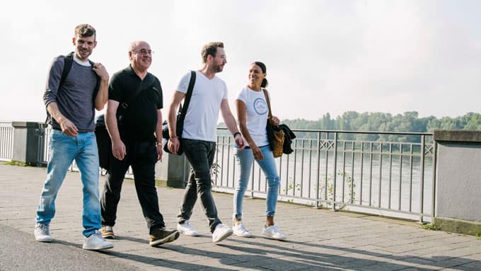 Entspannter Spaziergang auf der Rheinpromenade. Die letzten vier MasterChef-Anwärter auf dem Weg zur Challenge im Sternerestaurant.