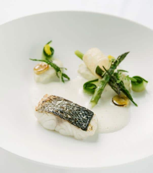 Das ihm zugewiesene Gericht ist nämlich "Wolfsbarsch an einer Yuzu Beurre Blanc mit Brandade, grünem Spargel und Banane". Die Komposition wirkt schon mal gelungen…