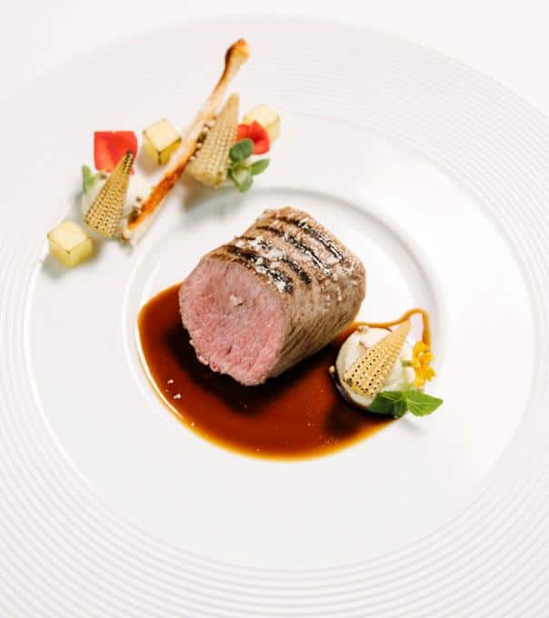 Noch ein bisschen Garnitur. Saucen-Willi serviert "Mediterranen Lammrücken auf Kosho-Jus mit Pastinakenpüree und gegrillter Mango".
