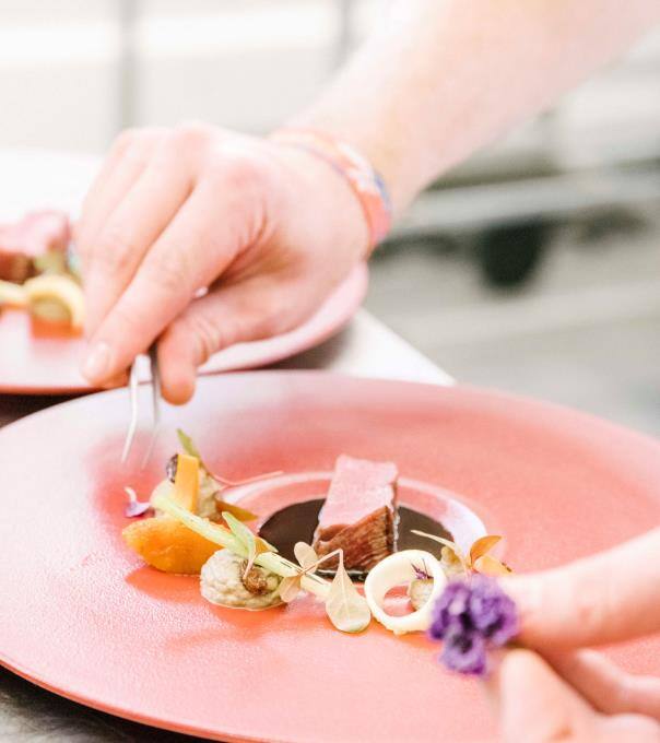 Fast fertig. Michael verpasst seinem "US Prime Beef an Terriyakisoße mit Auberginenpüree und süß-saurem Gemüße" den letzten Schliff.