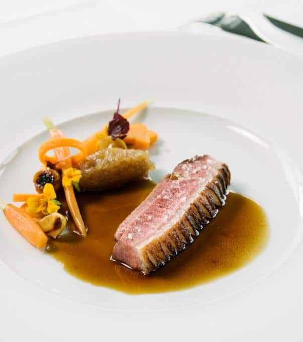 Ihr Teller: "Silver Hill Entenbrust auf Ingwer-Ahorn-Jus mit Süßkartoffelpüree und Birnenchutney".