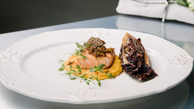 Sie serviert der Jury ein "Lachsfilet im Kräutermantel mit gedünstetem Chicorée auf Sellerie"…